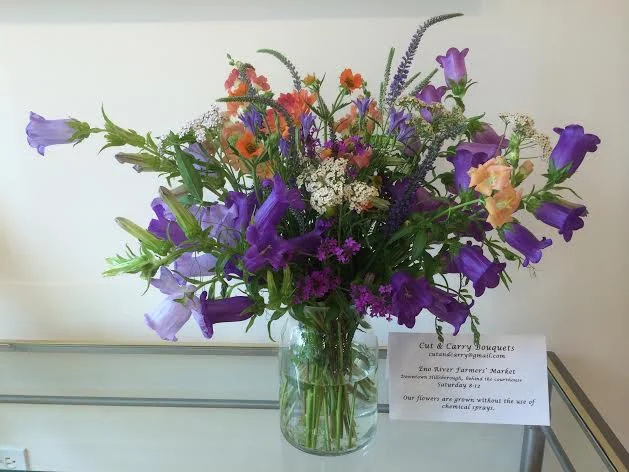 Cut and Carry Bouquets started as a backyard flower garden that provided bouquets to Meals on Wheels during the summer. After interning at Breeze Farm where we learned organic growing techniques as well as how to grow field flowers, we expanded the business into growing over 200 types of flowers, most started from seed. From April through October we create beautiful vase-ready bouquets for our Eno River Farmer’s Market customers and also provide speciality stems to enable customers to select and fashion their own bouquets. In addition to flowers, we also grow figs, berries and pears. All of our flowers and fruit are grown in an environmentally friendly manner.